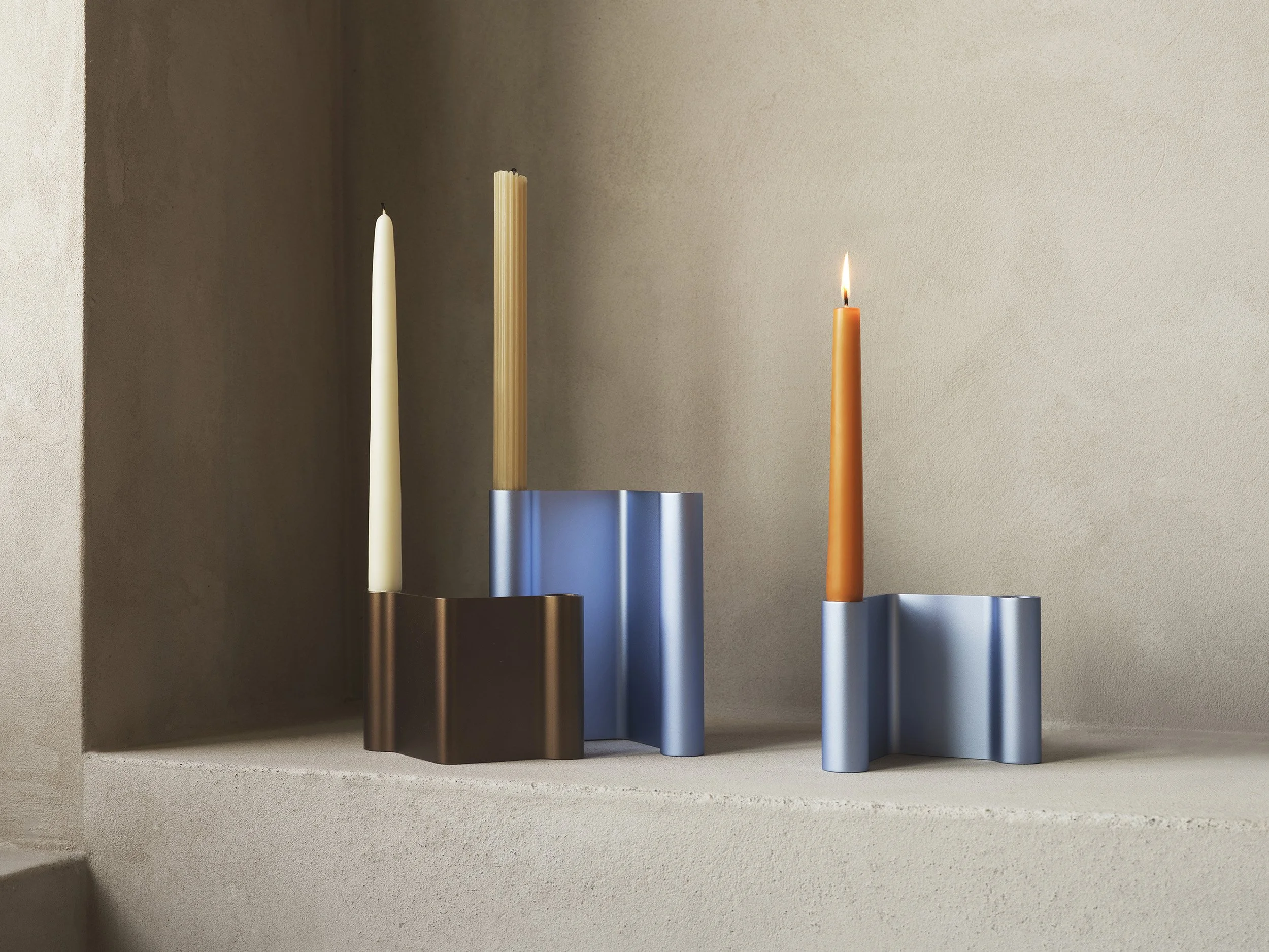 Candle holder made from extruded aluminium. Available in two heights and several anodised colours.